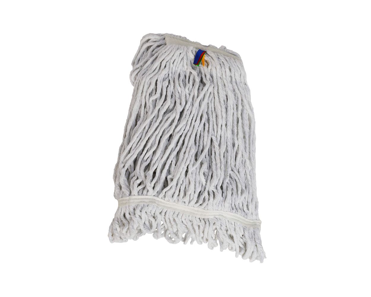 Blended cotton, looped end mophead with stay flat band and coloured tabs. Launderable.