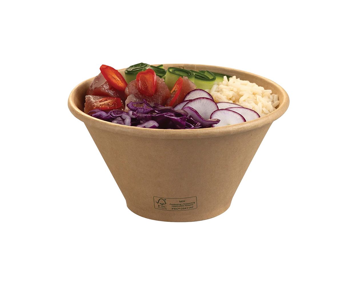 These 600ml Stagione PP coated bowls feature a distinctive tapered design that enhances food presentation and gives the impression of greater volume, making them ideal for premium salads and protein-based meals like fish with sides. The wide opening maximizes product visibility, while the PP coating ensures a reliable leakproof barrier, making them suitable for various food applications.