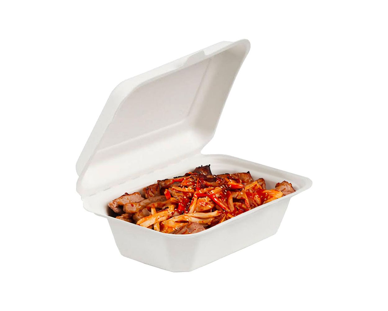 These hinged food boxes are manufactured from 100% sugarcane fibre and can be used in cold cabinets as well as microwaves. Water resistant to 100ºC & oil resistant to 150ºC they are perfect for take-aways and fast-food.