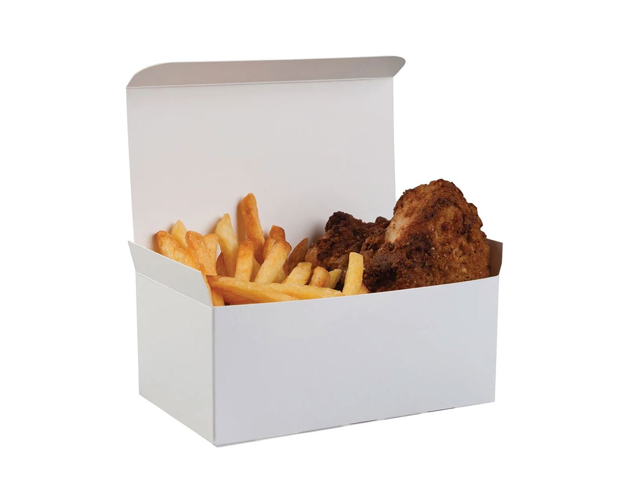 This white box is ideal for a variety of food combination and its simple product presentation is ideal for many kinds of fast-food meals and snacks (grilled chicken, chicken wings, chicken nuggets, fish, shrimp, onion rings, potato wedges, French fries, etc.), this multi-food paperboard box is ideal for eating on the run or as a container for instant eat.