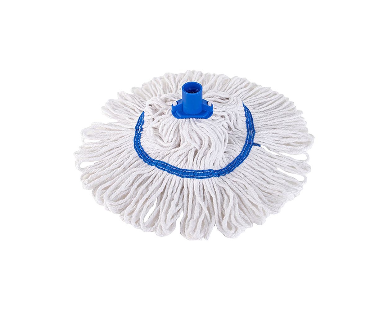 A circular mop head with a T1 screw thread socket. The stayflat band holds the circular shape enabling the mop to cover a larger floor area, whilst the looped end yarn prevents linting and the yarn tangling in use. Made from a unique blend of polyester and cotton yarns for improved strength and absorbency.