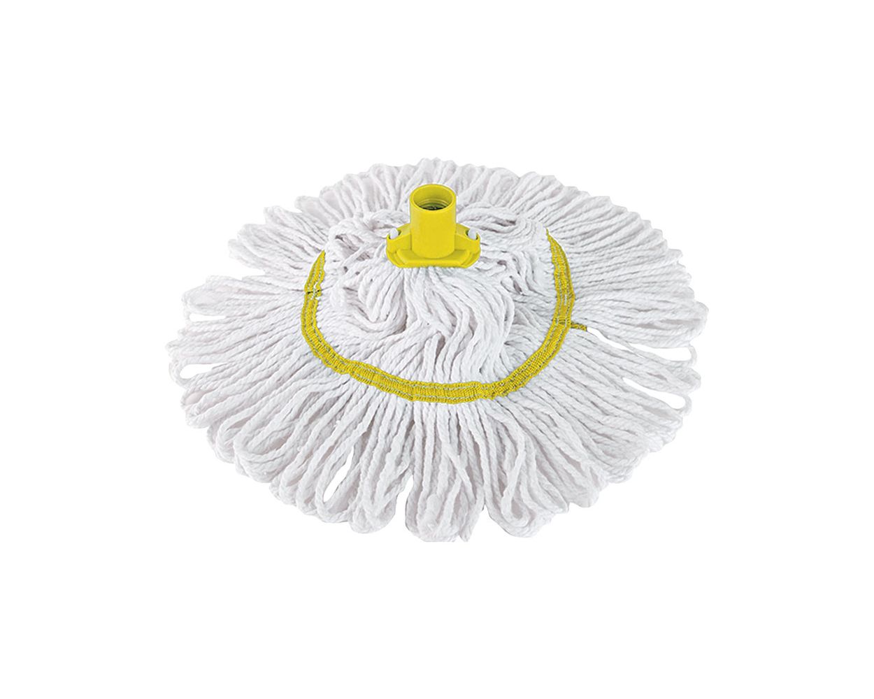 A circular mop head with a T1 screw thread socket. The stayflat band holds the circular shape enabling the mop to cover a larger floor area, whilst the looped end yarn prevents linting and the yarn tangling in use. Made from a unique blend of polyester and cotton yarns for improved strength and absorbency.
