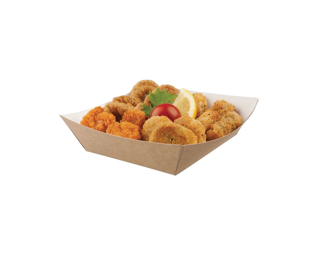 This paperboard tray is suitable for many different kinds of snacks and finger foods such as burgers, French fries, chicken nuggets, nachos, potato wedges, etc. In addition its simple product presentation, this tray is an ideal container for instant eat.
