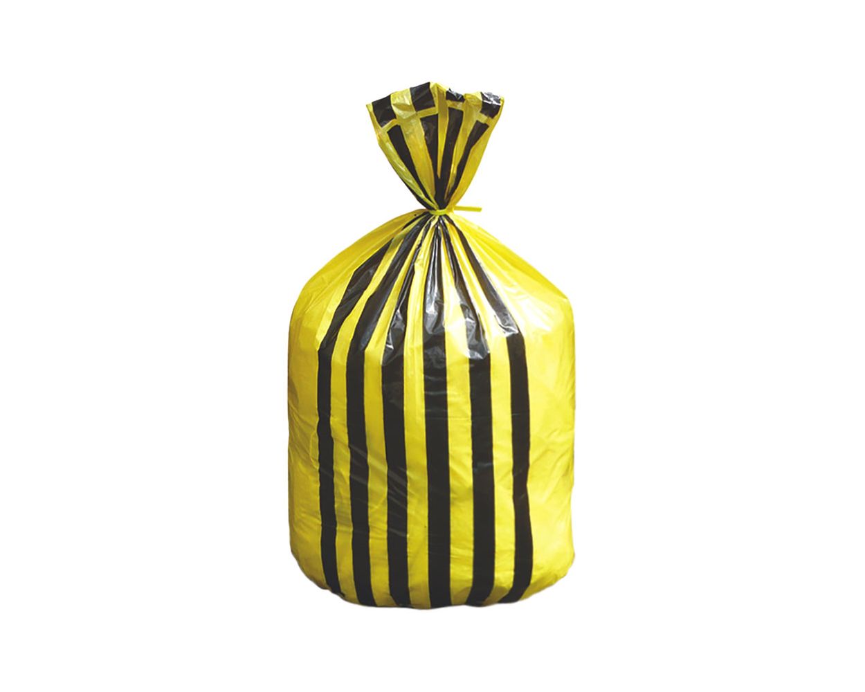 Yellow tiger stripe medium duty clinical waste sacks for landfill disposal.
