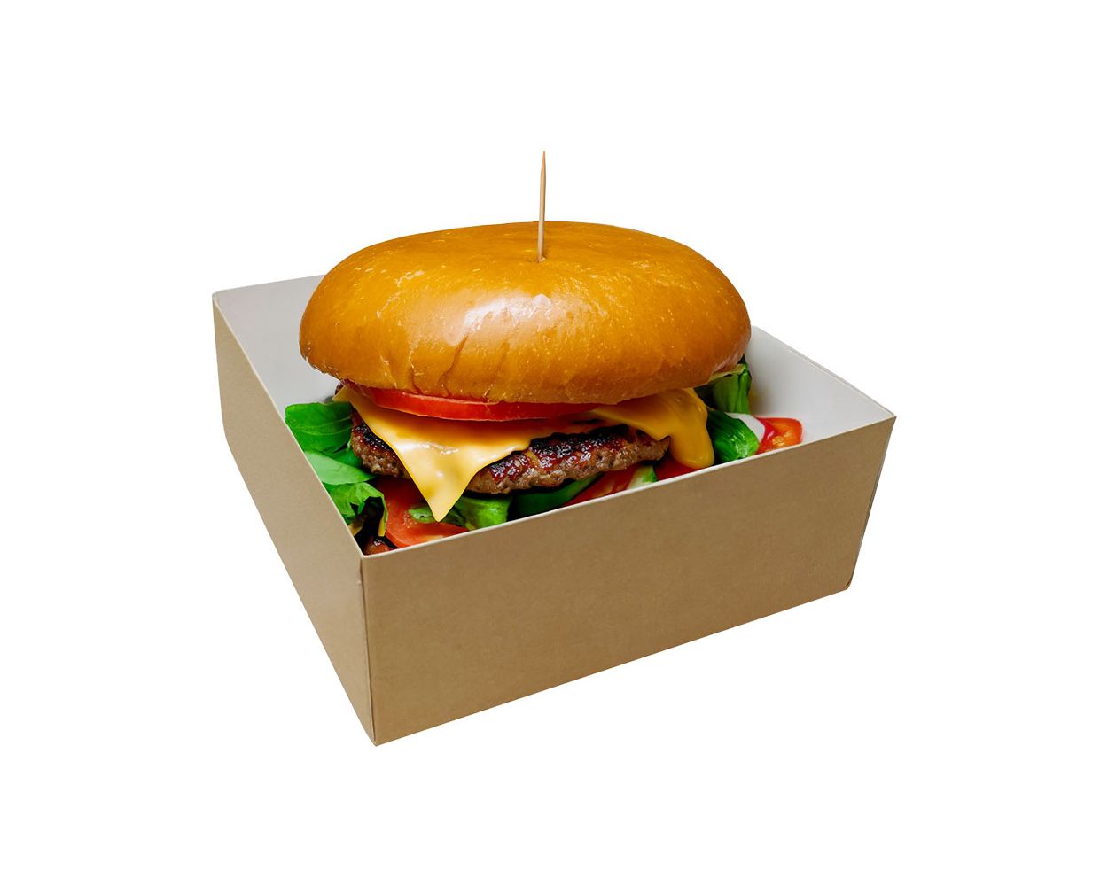 Serve burgers, snacks, or sides with confidence using these 4 x 4" open burger trays, made from virgin food-grade kraft/white paperboard. Sturdy, grease-resistant, and eco-friendly, they’re perfect for food trucks, takeout, or casual dining, offering a clean presentation without the need for a lid.