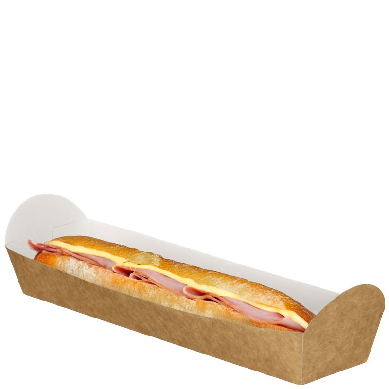 The Clasp Seal Baguette Sleeve is perfect for packaging filled baguettes and bread rolls as well as hot dogs, paninis, slices of pizza and Swiss rolls. The food product can be inserted into the sleeve, which is already sealed along the lengths. Then the two ends can be closed easily with a sealer. With its integrated paperboard (brown printed kraft effect), the pack is stabilised and offers optimum product protection. It is easy to use both during the packaging of the food product and for the end customer to hold and transport.