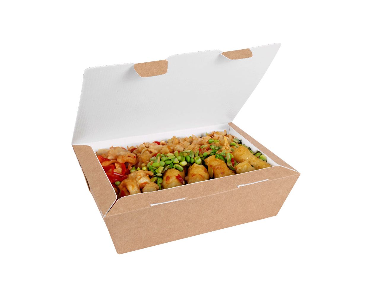 These small food to go boxes are made from corrugated card and have a greaseproof and leakproof PET lining, allowing you to serve antything from salads, to burgers, or even curries and noodle dishes.