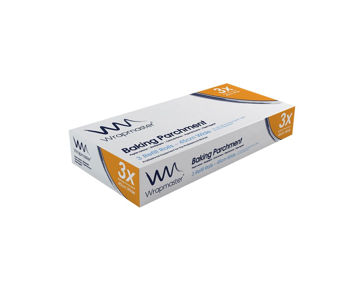 Wrapmaster 4500 Baking Parchment refill rolls are available for use in the Wrapmaster 4500 and Wrapmaster Duo dispensers. Ideal for all baking requirements, it has a silicone coating which eliminates the need to pre-grease the parchment, providing excellent non-stick quality while preventing the paper from burning.